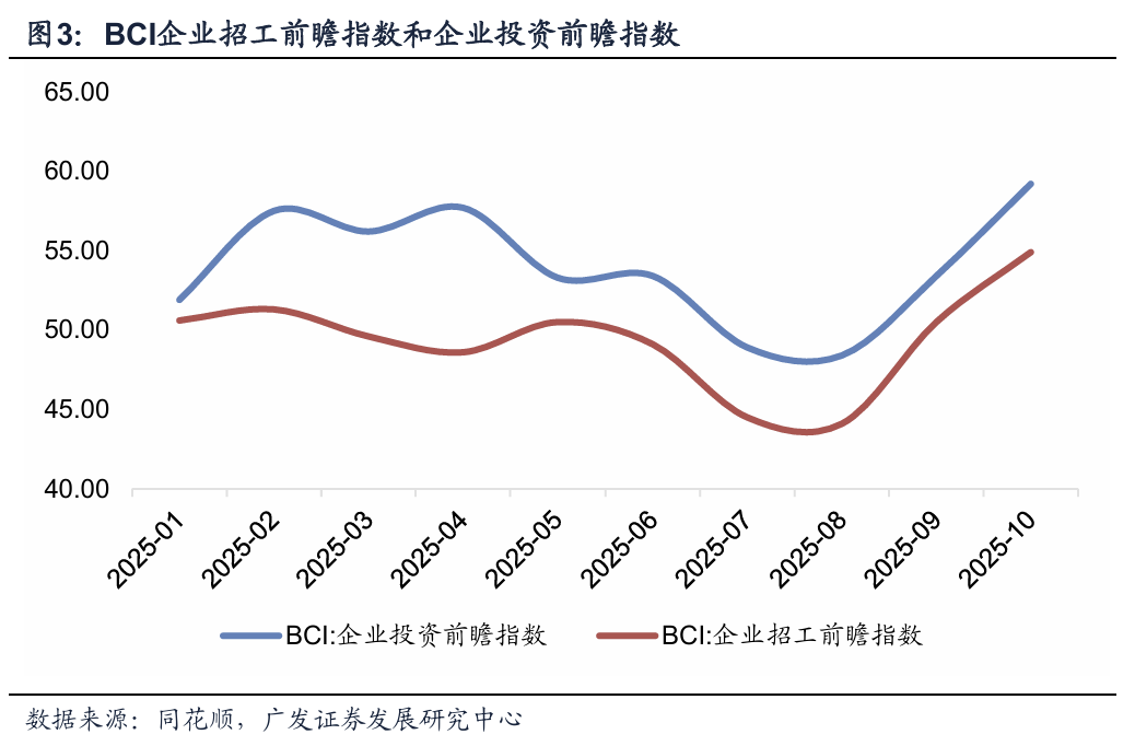 10月BCI招工前瞻指數為54.9,高於前值的50.5,這一指標7-8月分別為44.5、44.1。