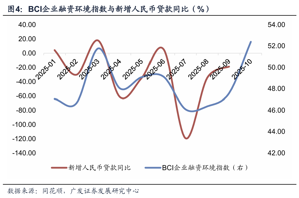 在前期報告中,我們提示10月EPMI數據超季節性反彈,推測可能和同期新型政策性金融工具集中落地帶動增量項目有關。10月27日出來的BCI數據指向一致,指標較9月上行0.9個點至52.0。9月同按月基數均偏低,10月實際上基數已上行,這一指標的表現進一步確認了下半年經濟「7-8月承壓、9-10月好轉」的節奏。