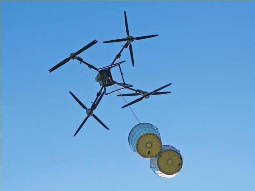 「我們一臺無人機最大載重量是170斤,實際裝載量會控制在120斤左右,這樣能保證飛行更加平穩,避免果實磕碰。」說話間,一架無人機抵近卸貨點,在下降、止停後,穩穩地將蘋果筐放在地上。李明巍上前摘下吊繩的掛鉤,飛手按動遙控器,無人機在空中掉頭,又往果園裝貨點飛去。