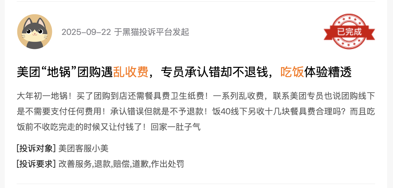 黑貓投訴平臺消費者投訴截圖在黑貓投訴平臺上,有消費者投訴稱:其在大年初一通過美團平臺購買「地鍋」團購套餐,到店後,店家並未提前告知團購外需額外收費,但在用餐結束後結賬時,卻被告知需額外支付「餐具費」、「衛生紙費」等多項雜費,金額達十幾元。投訴人當場提出質疑,認為團購價應包含基本餐具等費用,且商家未事先告知的行為涉嫌侵犯消費者知情權。事後,投訴人聯繫美團客服,平臺專員雖承認「團購線下不應支付任何費用」屬於商家違規操作,但最初僅停留在口頭承認,拒絕為消費者辦理退款。