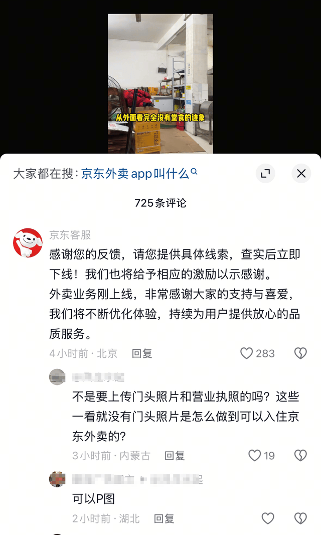 然而,即使京東外賣層層把關、嚴格監控,但仍有用戶發現部分商家盜用其他城市門店圖片,冒充「堂食店」。