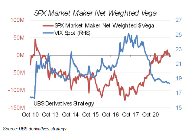 瑞銀策略師Kieran Diamond等人指出,10月16日當天,標普500指數期權的做市商在市場下跌時持有的波動率頭寸變得更為「空頭化」,當這些頭寸被回補時,可能進一步放大了VIX的飆升。此外,交易員可能還持有VIX看漲期權的空頭倉位,對這些倉位進行對沖的操作也助推了波動率的上升。