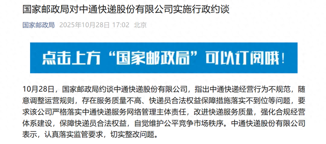 10月28日,國家郵政局官網發佈消息稱,該局對中通快遞(02057.HK)進行了約談。