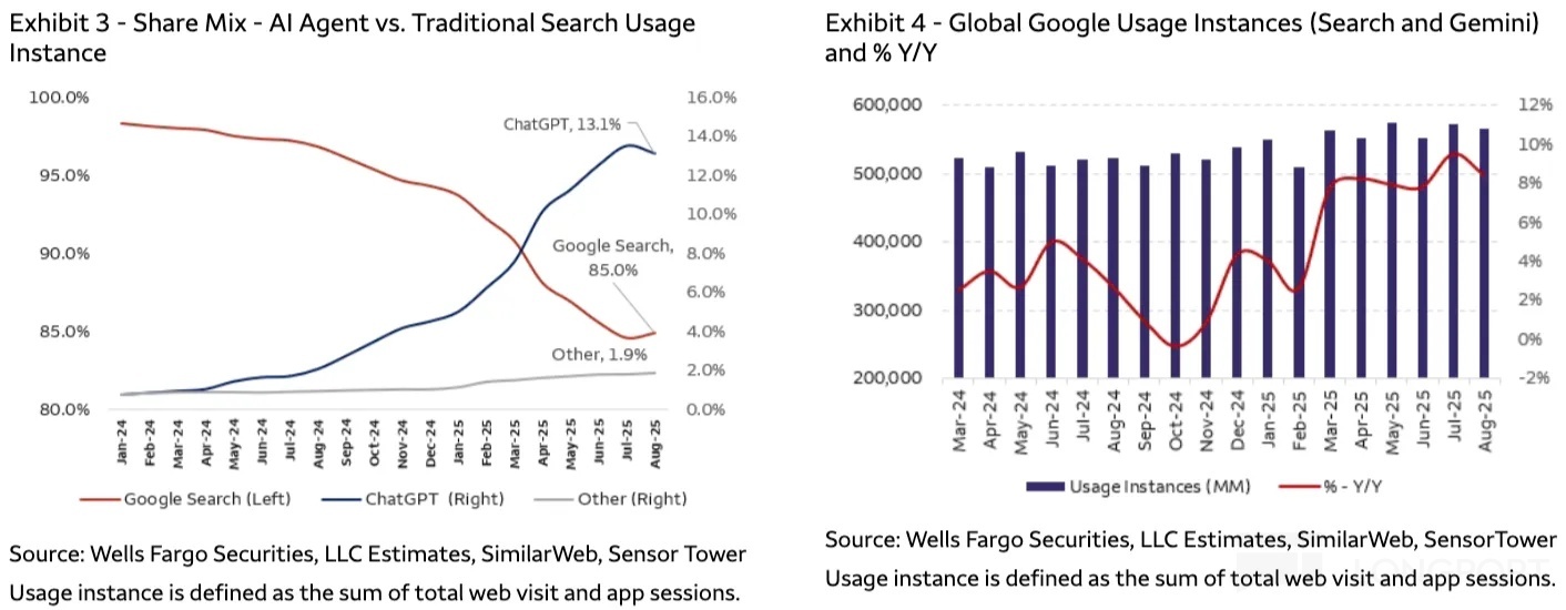 一方面,搜索上 AI Overview 和 AI Mode 拉高了用戶活躍,將二季度跌到 90% 以下份額的谷歌重新又拉了回來。同時谷歌還通過新產品 Nano Banana 將 Gemini 生態的活躍度進一步激活。