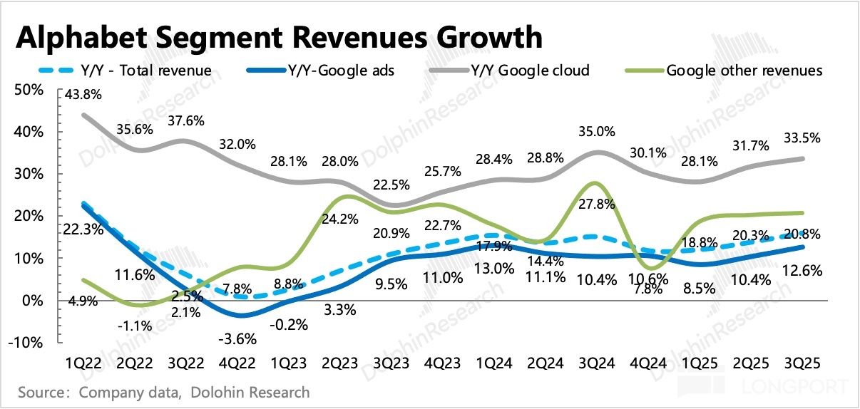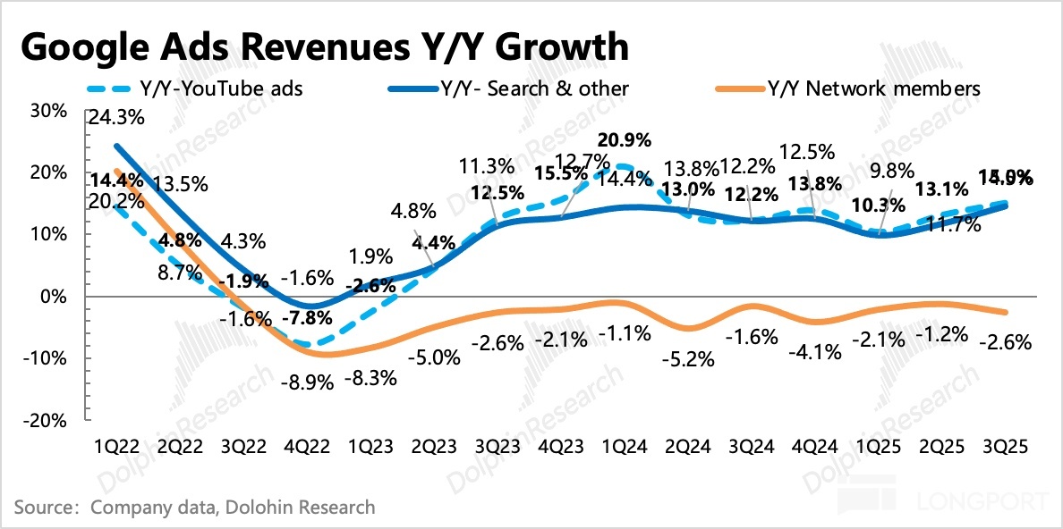 (2)意外的是搜索,不僅沒有在高基數上放緩,並且還更快加速,這就更談不上是否有 AI 侵蝕的問題了。從調研來看,增長驅動主要來自於AI Overviews、AI Mode 對搜索查詢量的提升,從而帶動展示量的增加。