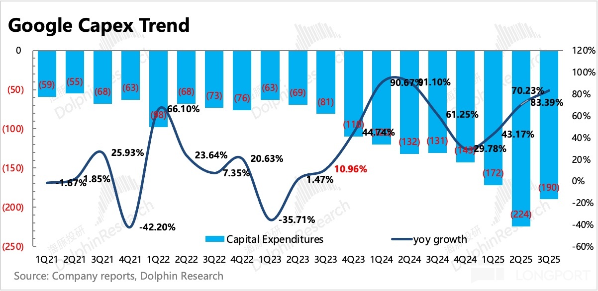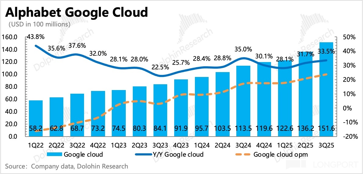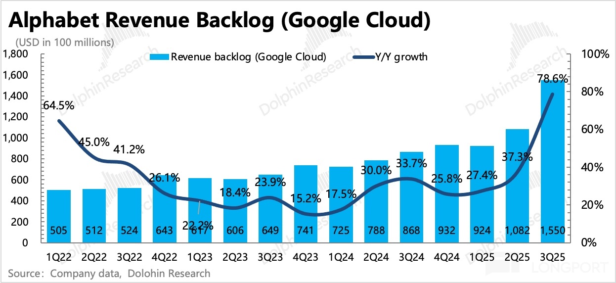2. 谷歌雲景氣度持續:雲業務現在已經主要看積存的未履約訂單了(Revenue Backlog),只要訂單積累保持高增速,那麼未來一段時間的雲收入增長就能夠保持。截至 Q3 末,積存訂單達到 1550 億,同比增長 43%,環比淨增 470 億,不包含最近剛爆出的 Anthropic 的 200 億訂單。有了這些訂單存貨,收入增速可以在一段時間繼續保持在 30% 以上。