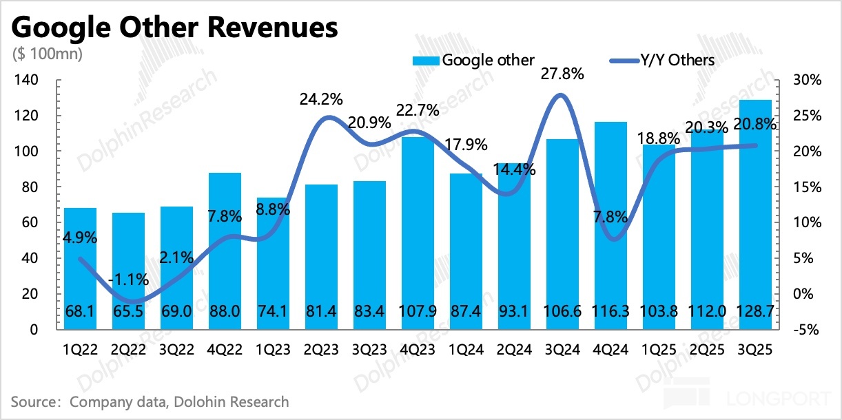 這部分收入主要由 YouTube 訂閱(TV、音樂等)、Google Play、Google、One、硬件(手機 Pixel 和智能家電 Nest)等組成。