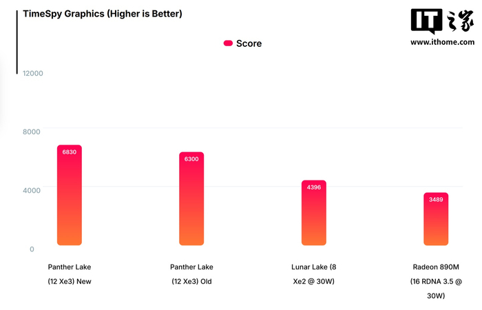 除了 CPU 部分,英特爾也增強了 Panther Lake 集成的 Xe3 核芯顯卡性能。在 3DMark Time Spy 測試中,經過優化的 12 核 Xe3 iGPU 跑分從之前的 6300 分提升至 6830 分,增幅達 8.5%。