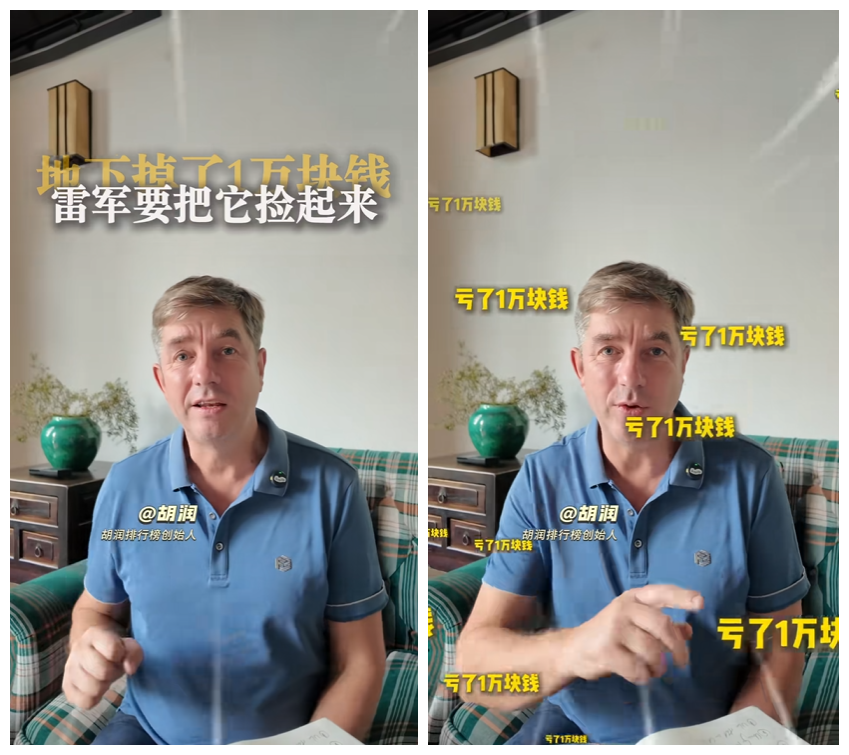 對於新晉財富「增長王」雷軍,胡潤前兩天還在抖音上發佈視頻調侃:「地上掉了1萬塊錢,雷軍要把它撿起來,那他已經虧了1萬塊了。」