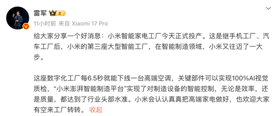 「這是繼手機工廠、汽車工廠後,小米的第三座大型智能工廠,在智能製造領域,小米又邁了一大步。」當日,雷軍在其個人微博分享了這一消息。雷軍表示,這座數字化工廠每6.5秒就能下線一臺高端空調,關鍵部件可以實現100%AI視覺質檢。