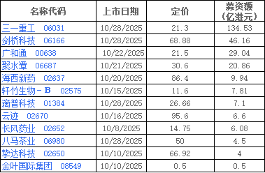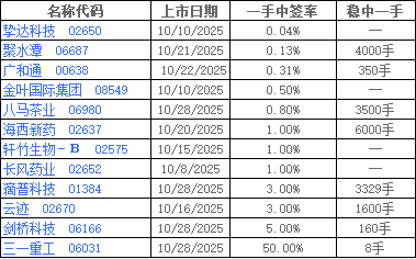10月港股抽新股市場迎來「豐收季」,賺錢效應尤為顯著。當月共有5只新股在首日掛牌時漲幅突破100%,其中此前奪得港股「超購王」的金葉國際集團表現搶眼,首日漲幅高達330%,進一步印證了市場對熱門新股的追捧熱度。不過,並非所有新股都能共享這份熱度,僅廣和通一家在首日破發,而此前以134.53億港元募資額成為「募資王」的三一重工,首日漲幅不足3%,在同期新股中表現稍顯遜色。