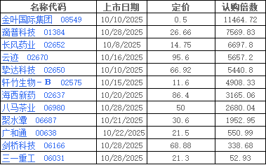 金吾財訊 | 港股「抽新股」市場的賺錢效應持續升溫。10月新股IPO數量繼續保持高位,認購情緒高漲,金葉國際集團認購倍數超萬倍,同時,多隻新股上市首日表現亮眼,市場交投活躍度顯著提升,為香港資本市場注入新活力。