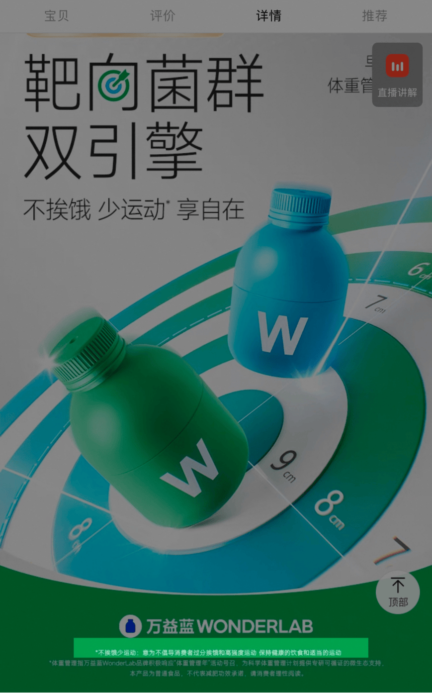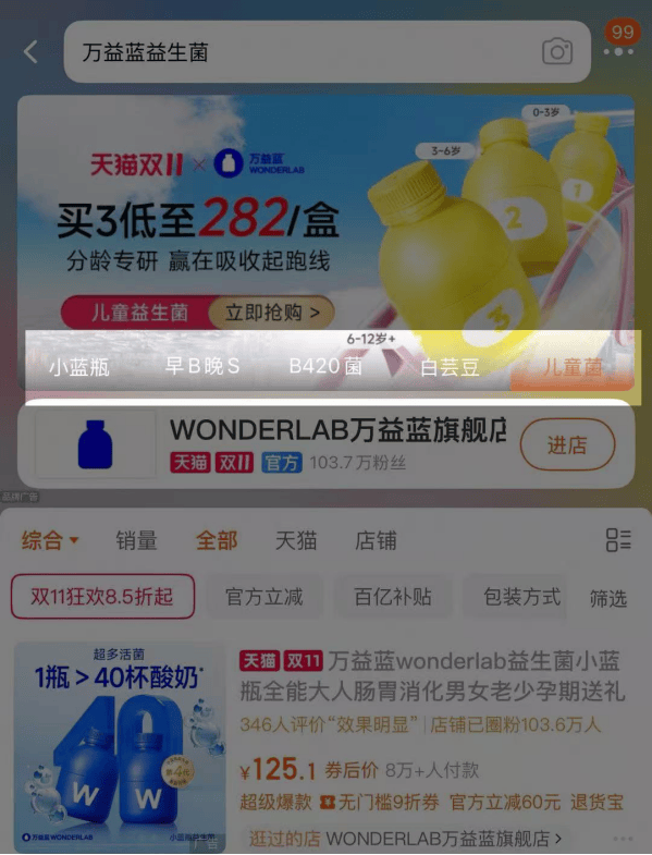 目前,萬益藍專注益生菌和營養補充劑的研發生產,天貓旗艦店的萬益藍益生菌家族主打腸胃調理的小藍瓶、「早B晚S」體重管理(即S100益生菌和BODY100益生菌組合)、B420體重管理、白芸豆壓片糖果以及兒童菌五大產品。