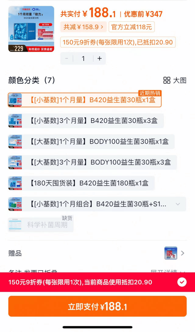 同樣作為添加了B420活菌的體重管理益生菌產品,萬益藍每瓶活菌數達到200億CFU(菌落形成單位),2g/瓶*30瓶一盒天貓券後售價為188元,單小瓶服用價格為6.27元。