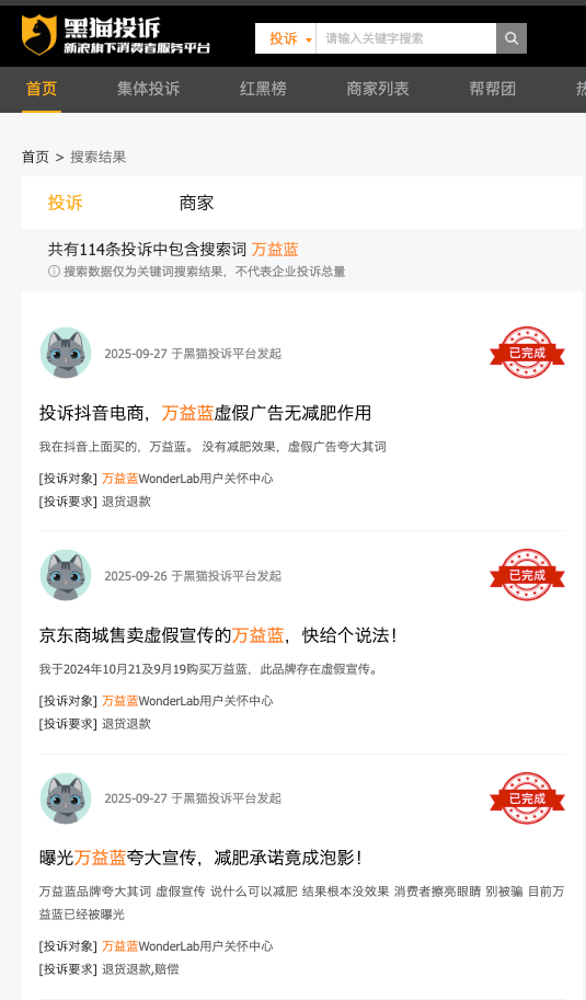 在黑貓投訴和小紅書等社交平臺,有不少用戶吐槽萬益藍色產品涉嫌虛假宣傳、無減肥作用。