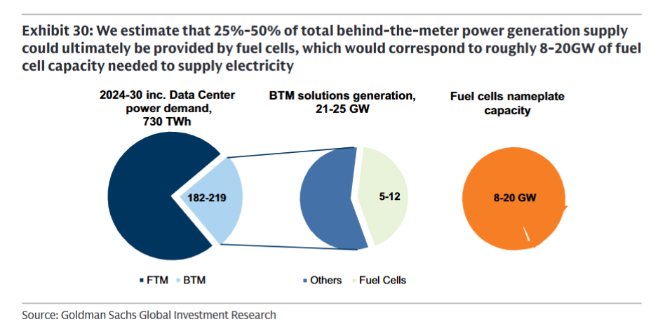 綜合以上優勢,高盛對燃料電池在數據中心市場的應用前景極為樂觀。報告的核心預測是,到2030年,燃料電池將佔據BTM解決方案市場25%至50%的份額,相當於8-20吉瓦(GW)的裝機容量。