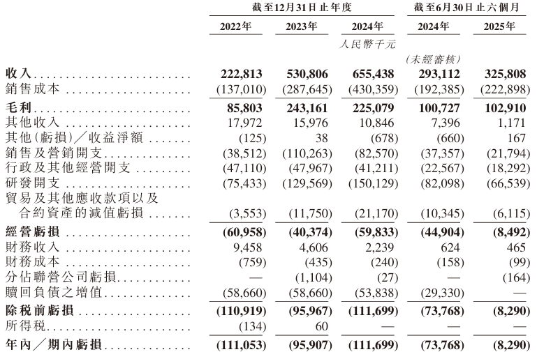 業績方面,2022年、2023年、2024年及2025年截至6月30日止六個月,該公司實現收入分別約為2.23億元、5.31億元、6.55億元、3.26億元人民幣;同期,年╱期內虧損約為1.11億元、9590.7萬元、1.12億元、829萬元人民幣。
