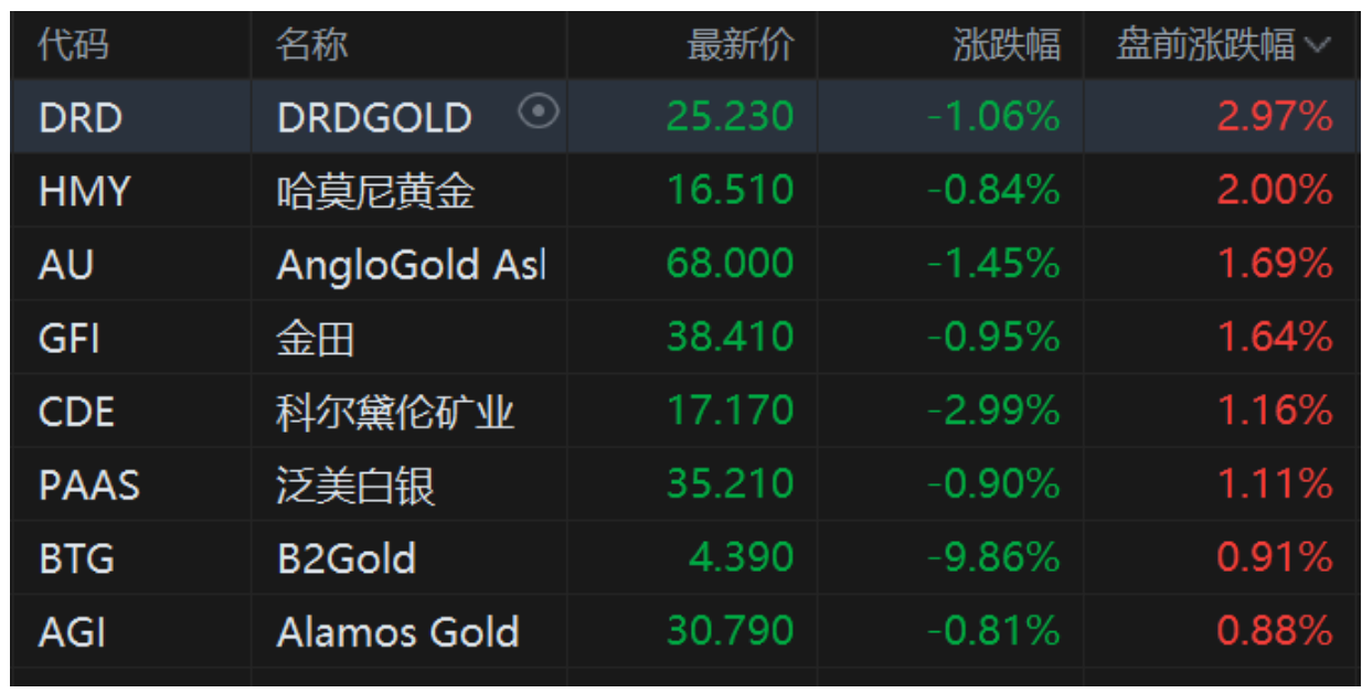 美股黃金股盤前普遍上漲,其中,DRDGOLD漲約3%,哈莫尼黃金漲2%,Anglogold、金田漲1.6%,科爾黛倫礦業、泛美白銀均有漲幅。