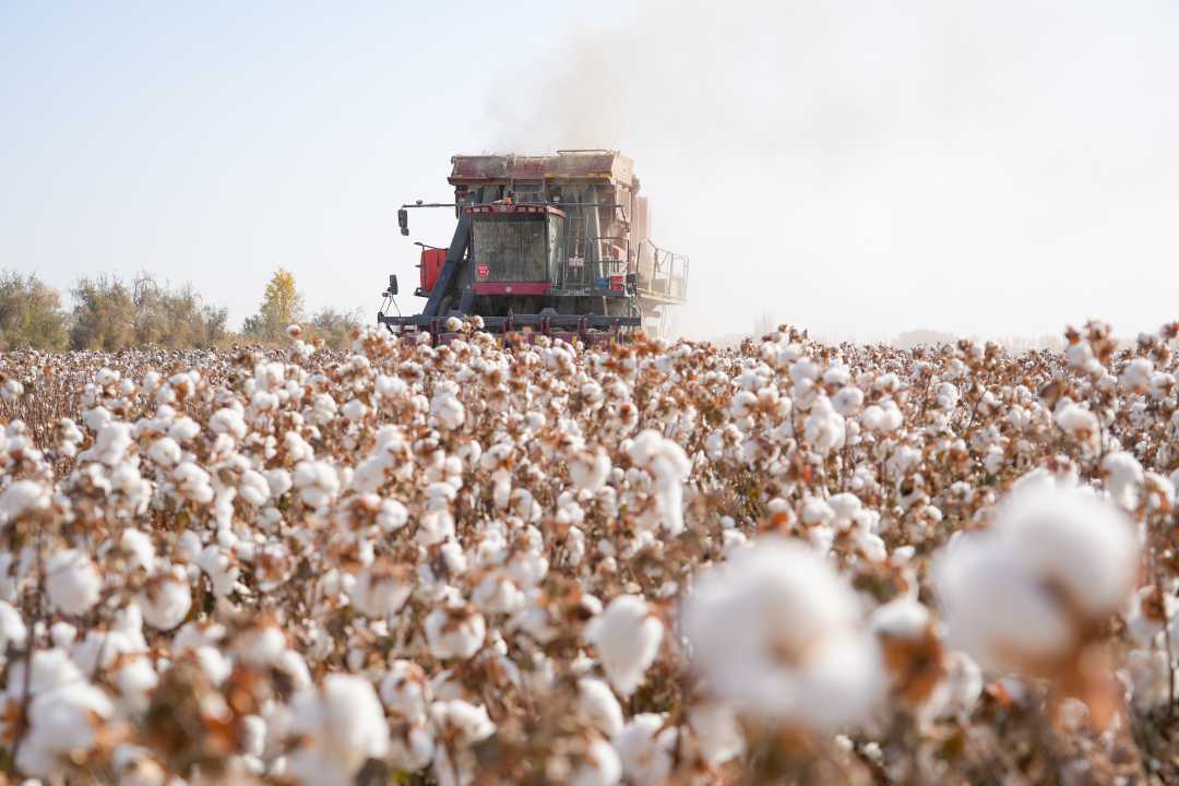 11月4日,新疆巴音郭楞蒙古自治州尉犁縣興平鎮孔雀村,採棉機在棉田裏採收棉花。今年尉犁縣種植棉花從播種、田間管理到採收,全程實現了機械化,農業機械化率達到99%。
