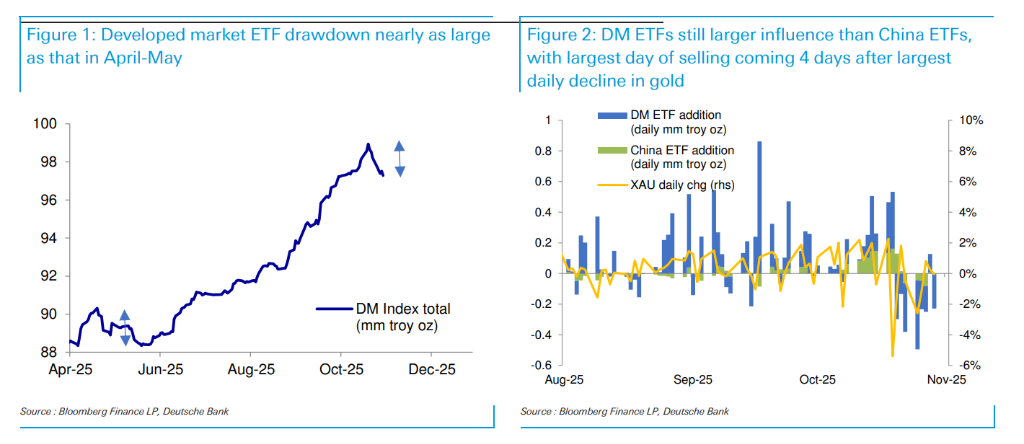 據追風交易臺,對於關注黃金市場的投資者而言,德意志銀行於2025年11月3日發佈的最新報告傳遞了兩個關鍵信號:第一,近期驅動金價回調的黃金ETF(交易所交易基金)大規模拋售正顯現減弱跡象,表明本輪價格修正已接近尾聲,而非新一輪下跌的開始。第二,備受關注的中國黃金增值稅(VAT)規則調整,預計對中國黃金需求和進口的整體影響溫和且有限。