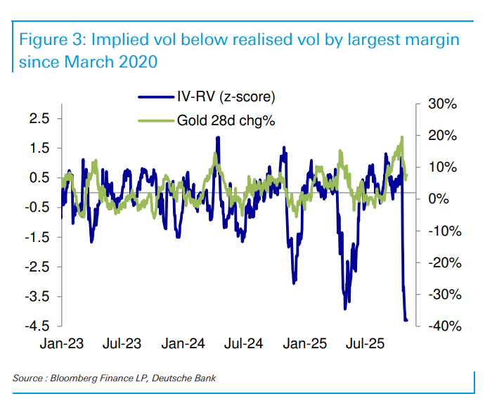 儘管拋售減弱是積極信號,但報告也發出了一項短期風險提示。目前,黃金的1個月已實現波動率(realised vol)遠高於引伸波幅(implied vol),二者之間的差距達到了自2020年3月以來的最大值。具體來看,引伸波幅與已實現波動率的差值為-12.6,偏離均值高達4.3個標準差。
