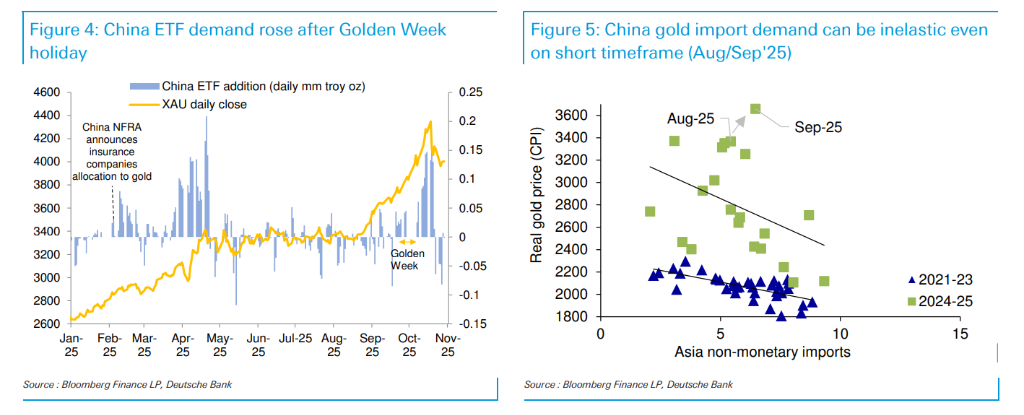 2.需求的非彈性特徵:長期來看,中國對黃金的需求相對缺乏彈性。報告提供了兩個有力的短期例證:在「黃金週」假期後,儘管金價較節前上漲了11%,但中國的黃金ETF需求依然走高,在10月16日達到每日流入0.14百萬(即14萬)金衡盎司的速度。在2025年9月,儘管金價上漲了9%,但中國的黃金進口量反而增加了6%。
