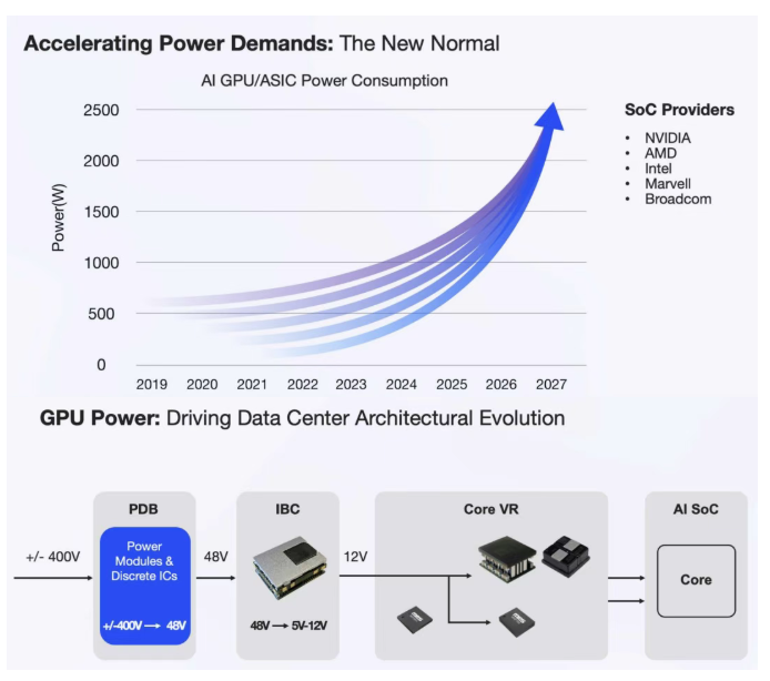 而電源管理芯片的迭代,實際上也可以運用在AI數據中心中,其核心思想就是控制用更大的電,通過功率提升來提升計算效率。所以在AI鏈的邏輯開始往發電、電力設備、儲能、電控等發散的時候,這類模擬芯片公司實際上將很可能在板塊中脫穎而出。