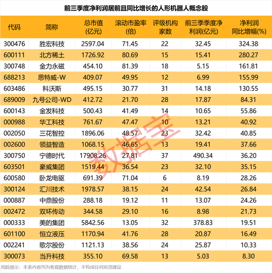 數據寶統計,2025年前三季度淨利潤逾5億元且同比實現穩定增長的人形機器人概念股,共計20只。其中,勝宏科技、北方稀土、金力永磁、思特威-W、科沃斯均實現翻倍增長,淨利潤增幅依次為324.38%、280.27%、161.81%、155.99%、130.55%。