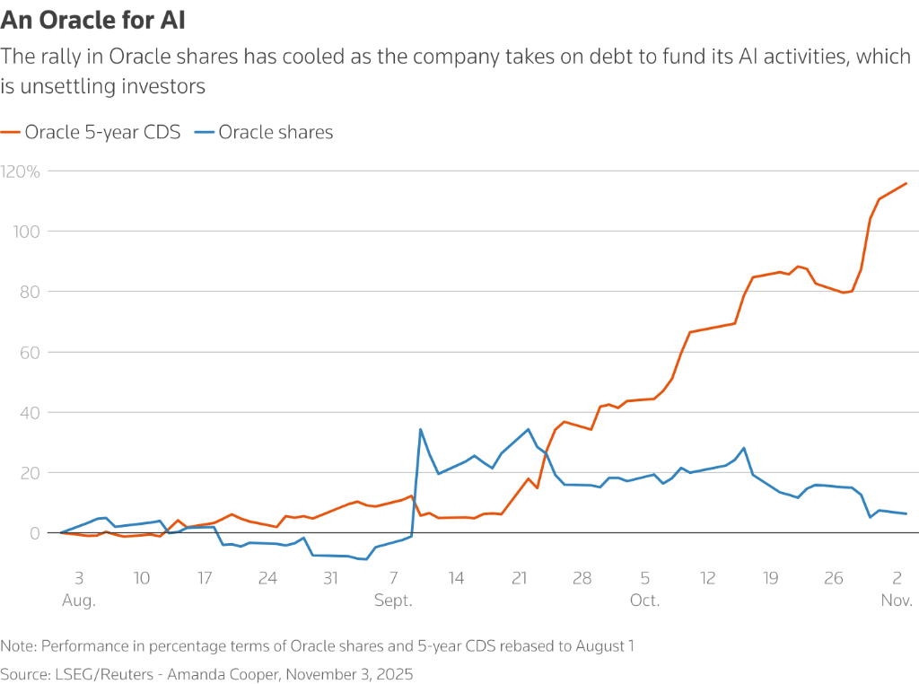在AI驅動的收入激增推動下,甲骨文的股價在2025年飆升了54%,有望創下自1999年以來最強勁的年度漲幅,使其成為華爾街最具價值的公司之一。然而,衡量其債券違約風險的信用違約掉期(CDS)成本同期卻在上升。這種保險產品的價格上漲表明,儘管股市熱情高漲,但債券投資者對其不斷攀升的債務水平正感到擔憂。股價和信用風險指標的背離,成為反映市場對AI「加槓桿」現象潛在焦慮的一個縮影。、