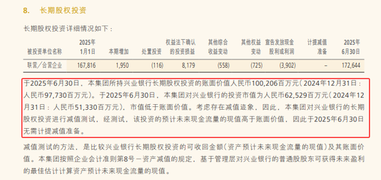 人保集團表示,在對興業銀行的投資進行減值測試後,認為該投資的預計未來現金流的現值高於賬面價值,因此無需計提減值準備。