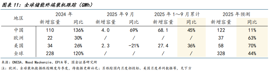我們在2025年中期策略中預測,中國/歐洲/美國/全球新增容量的同比增速分別為11%/63%/70%/44%。2025年1~9月國內累計同比增速達45%,顯著高於預測值;美國8月儲能併網2.3GWh,同比-21%、環比-33%;1~9月累計裝機27.4GWh,累計同比+36%,8月初美國簽署修改後ITC法案,項目搶裝提前併網,9月實際併網量呈回落趨勢。