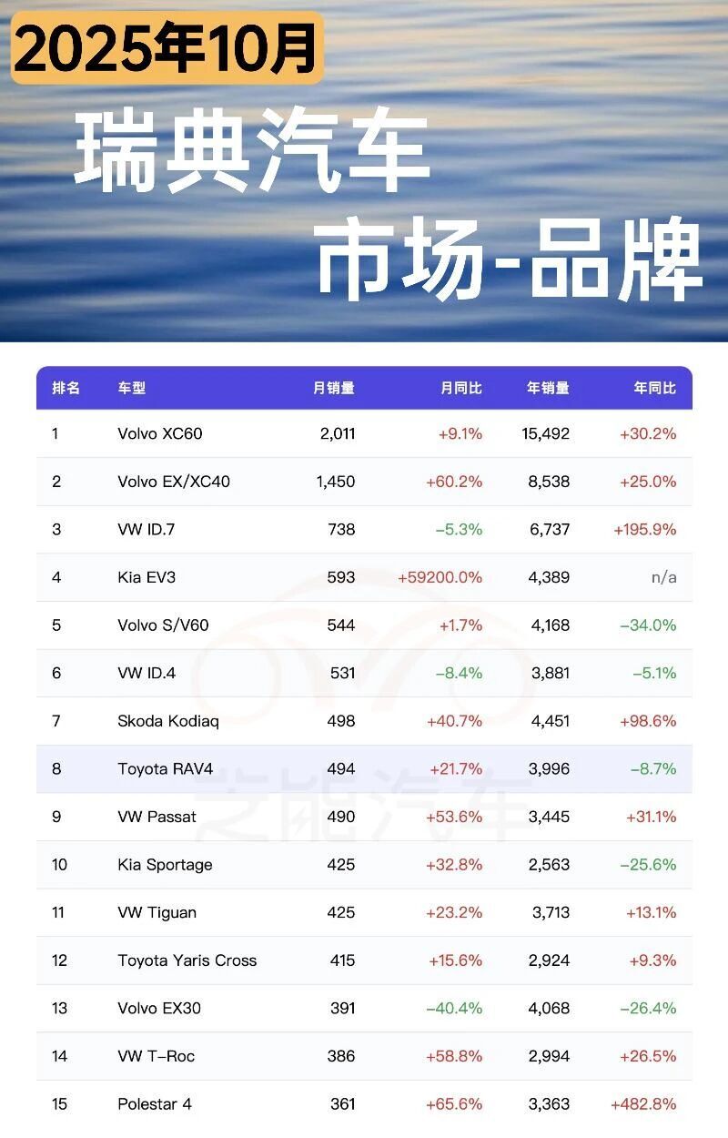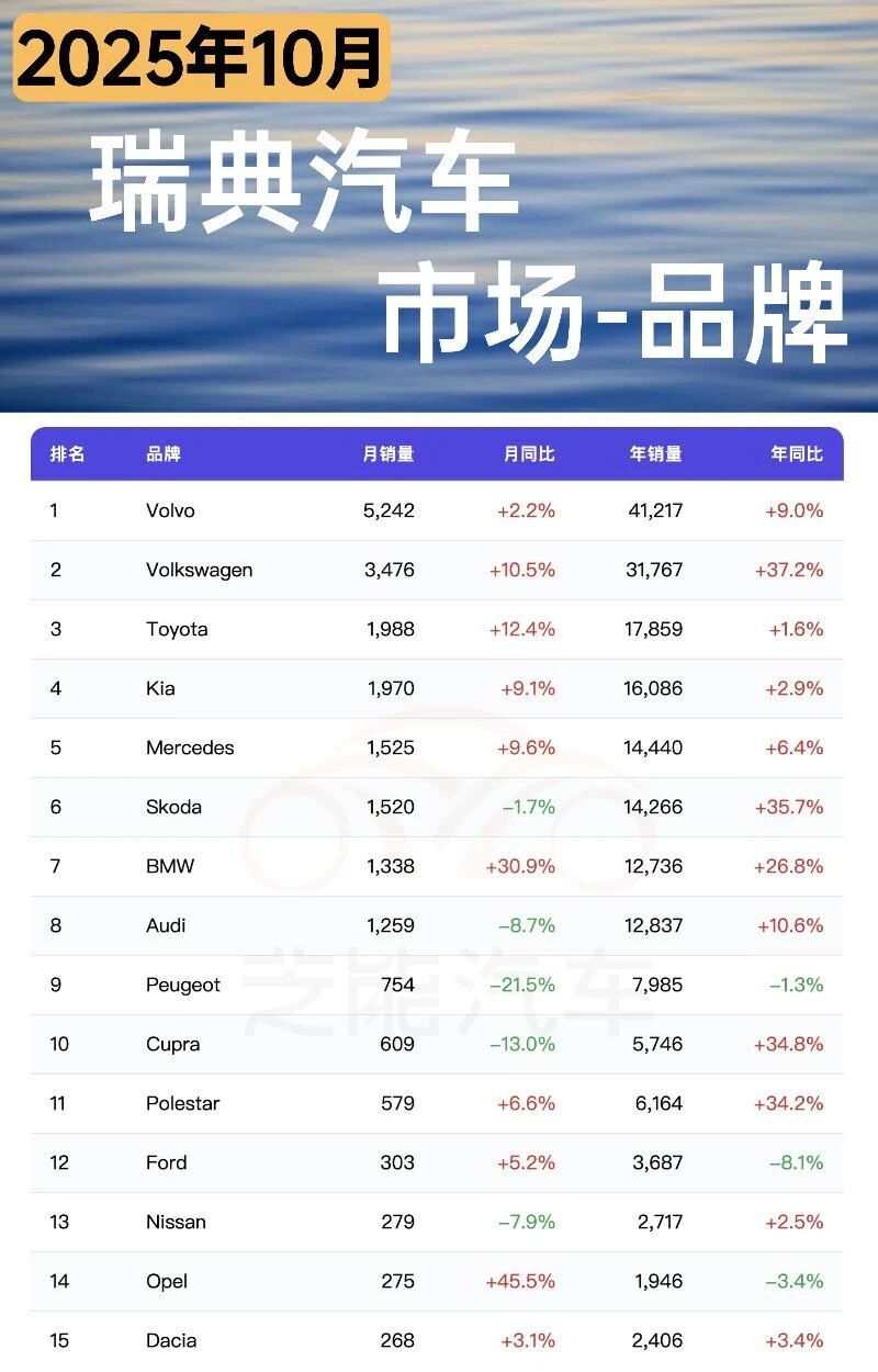 瑞典市場在2025年10月中國車企表現很有限,銷量也不大。