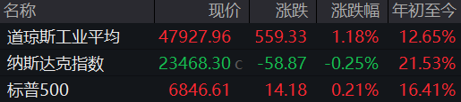 當日,道瓊斯工業指數上漲1.18%,報47927.96點,創收盤歷史新高;標普500指數微漲0.21%,報6846.61點;納斯達克綜合指數則微跌0.25%,報23468.3點。
