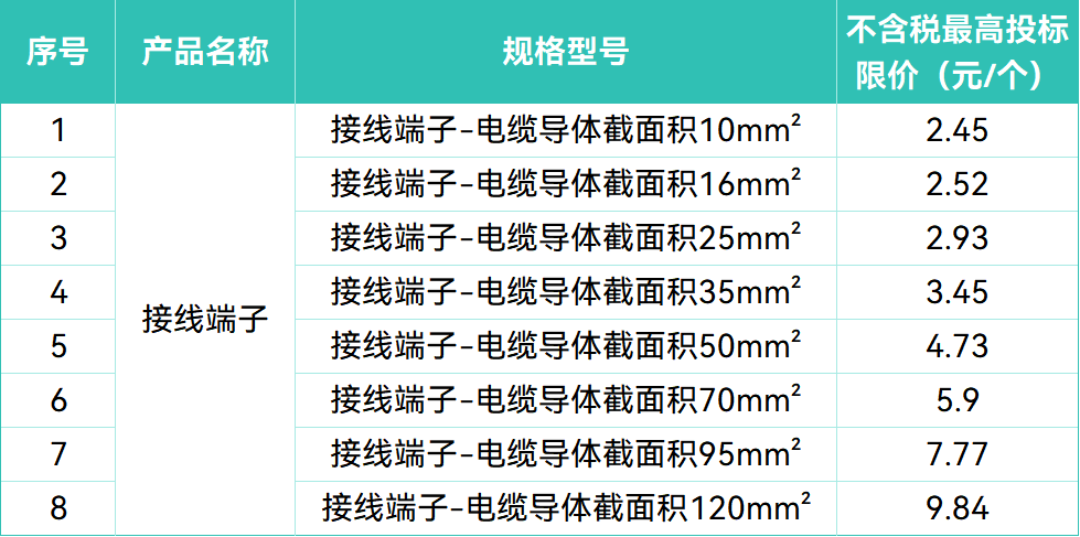 本項目設定了嚴格的最高投標限價。其中,基準型號「阻燃鋁電纜-ZA-VLV(4×25)」不含稅單價上限為11.97元/米;接線端子單價限價從2.45元/個(10mm²)至9.84元/個(120mm²)不等。