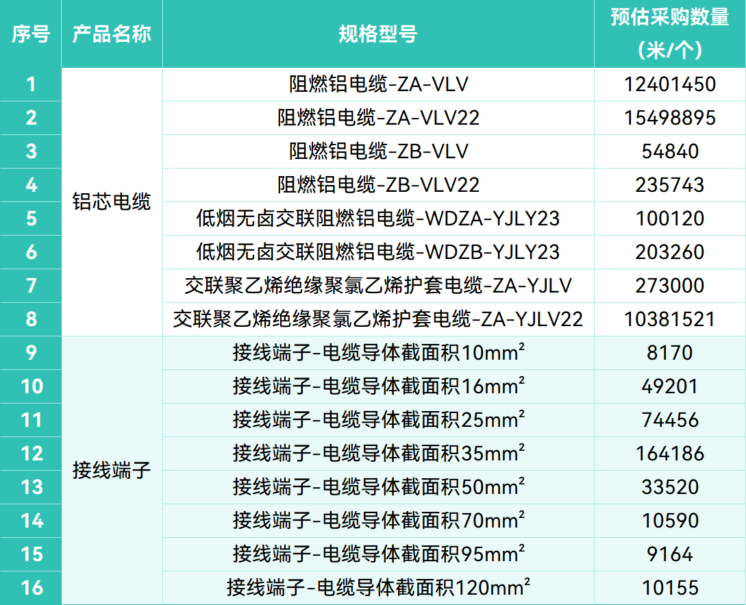 該項目合同有效期為1年,預估採購總量高達3915萬米鋁芯電纜,並同步採購配套接線端子近36萬個,資金來源為招標人自籌,目前已落實到位。