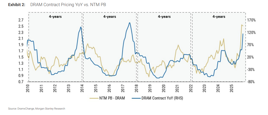 另一方面,大摩表示,隨着DRAM合約價格飆升,供應商掌握了史無前例的定價權。