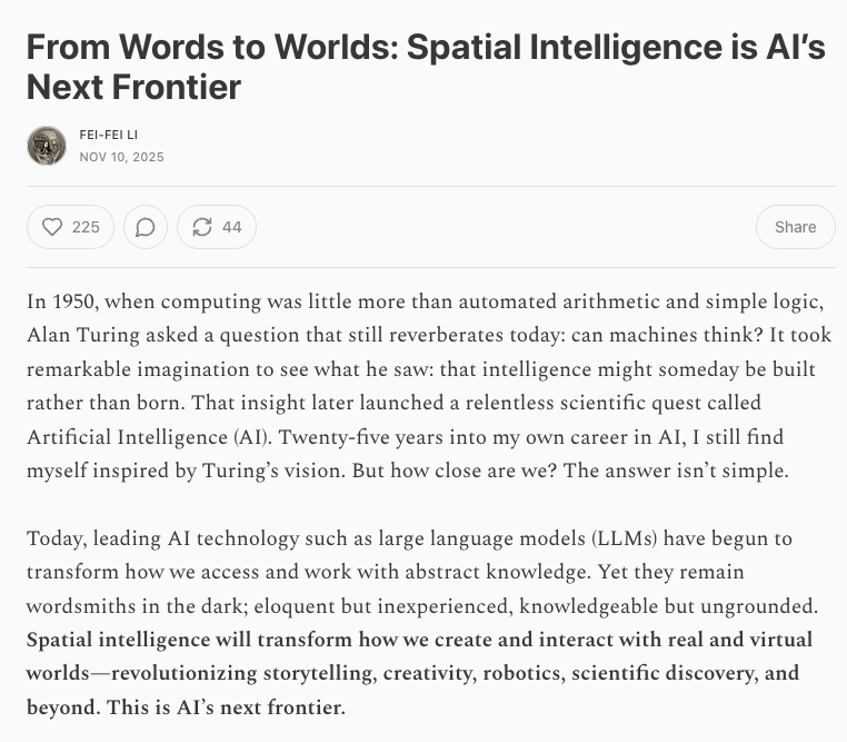 《From Words to Worlds: Spatial Intelligence is AI’s Next Frontier》,圖片來源:李飛飛博客