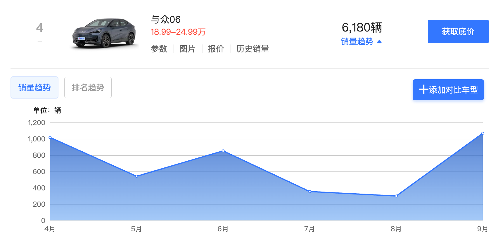 ID.與衆是首款懸掛金色大衆徽標的車型,定位純電轎跑SUV,於2024年7月17日正式上市,售價20.99萬元至24.99萬元。自上市以來,ID.與衆在上市後表現平淡,先後經歷多次調價,也沒有激起水花。2024年11月,大衆安徽對ID.與衆的整體定價下調至16.99萬元至20.99萬元。今年4月,ID.與衆改款後更名為與衆06,售價18.99萬元至24.99萬元(限時一口價14.99萬-20.99萬元),新車採取降價增配的策略,對智能化、安全配置和動力續航進行升級。數據顯示,2025年前三季度ID.與衆06銷量為6180輛,表現一般。