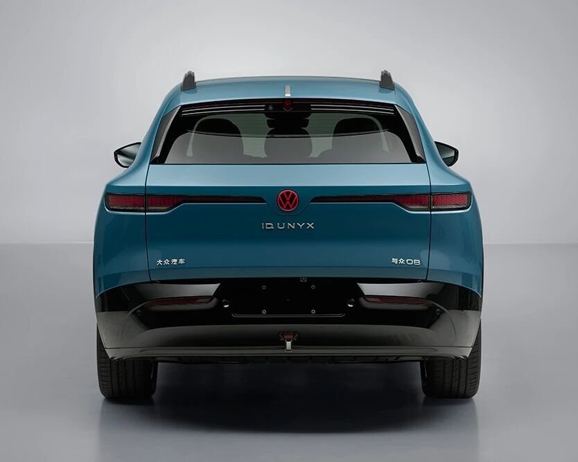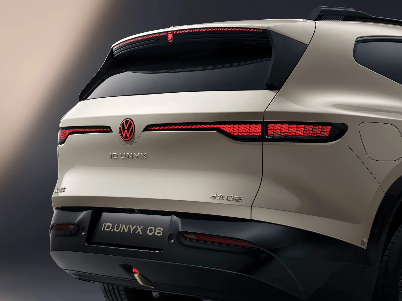 結合實車圖來看,與衆08基本延續ID. EVO概念車的設計,前臉採用封閉式造型,狹長且上揚的大燈組,配合中央大衆品牌LOGO,下包圍設計有黑化裝飾件,整體延續了大衆安徽大膽、前衛、犀利的設計風格。車身側面,其對A柱進行黑化處理,呈現出懸浮車頂的視覺效果,並配備有車頂行李架,採用密輻式輪圈造型,配合隱藏式車門把手,整體十分時尚。車尾部分,其採用狹長平直的尾燈組,相比車頭要相對內斂,配備可發光的紅色尾標,下側為「ID.UNYX」金色標識,尾門右側「與衆08」標識表明身份信息。尺寸方面,與衆08的長寬高分別為5000/1954/1672(1688)mm,軸距為3030mm,定位全尺寸SUV,採用五座佈局。