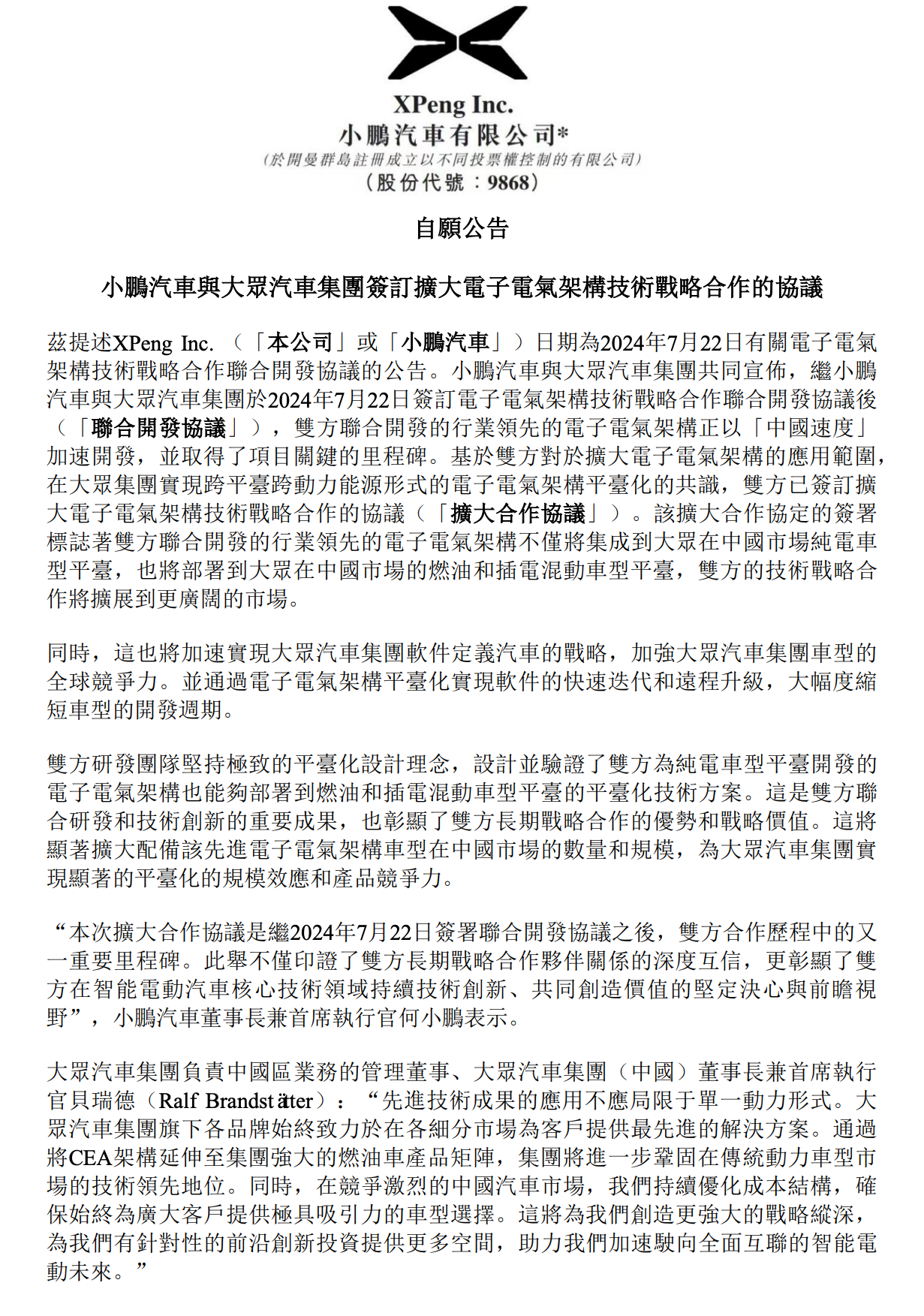 8月15日,小鵬汽車和大衆汽車集團共同宣佈,小鵬汽車與大衆汽車集團簽訂擴大電子電氣架構技術戰略合作的協議,該擴大合作協議的簽署標誌着雙方聯合開發的行業領先的電子電氣架構不僅將集成到大衆在中國市場純電車型平臺,也將部署到大衆在中國市場的燃油和插電混動車型平臺,雙方的技術戰略合作將擴展到更廣闊的市場。