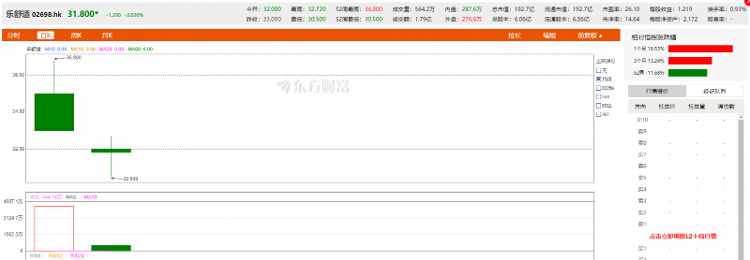 上市首日,樂舒適以高開33%的強勢表現登陸港交所,盤中最高一度升至36.8港元/股,最終收於33.00港元/股,總市值逼近200億港元,當日成交額14.87億港元,換手率7.03%,市場熱情高漲。