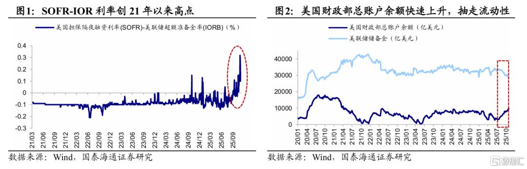 一是美國政府關門帶來美元流動性緊張。10月初美國政府關門以來政府支出停滯,截至10/29,財政部總賬戶餘額快速上升至1.0萬億美元,較6月0.3萬億美元的低點,相當於抽走市場約0.7萬億美元的流動性。同時,目前聯儲局仍在縮表,這進一步加劇「美元荒」,美國擔保隔夜孖展利率與聯儲局超額準備金率的利差快速走闊至最高32BP,創20年以來的新高,流動性的收緊成為推動美元走強的重要動力。