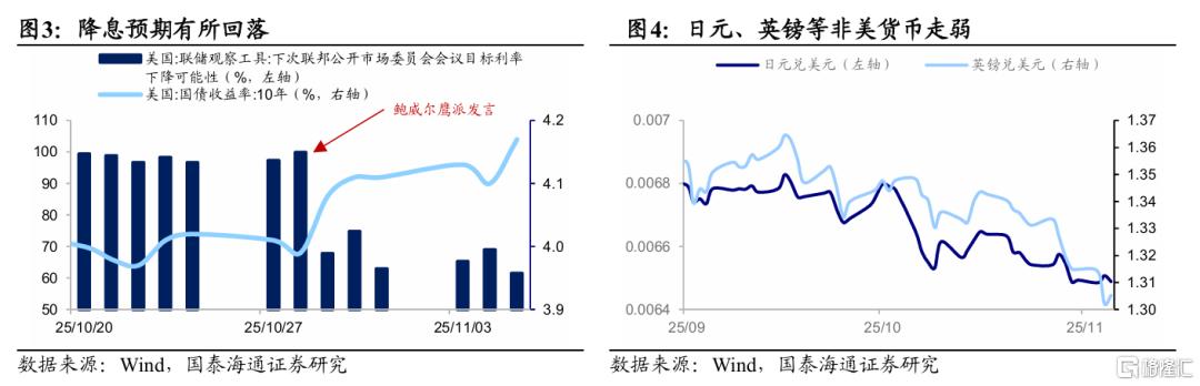 三是以日元為代表的非美貨幣較為疲弱。近期非美貨幣的走弱也支撐美元走強:日元方面,近期高市早苗當選日本首相,新政府傾向於財政擴張和鴿派貨幣政策,10月日央行維持利率不變,並釋放觀望信號,加劇日元貶值;英鎊方面,因工資和通脹數據走弱,英鎊匯率承壓,加之英財政大臣表示可能推出加稅與減支措施,這進一步加大經濟下行壓力,推動英鎊貶值。