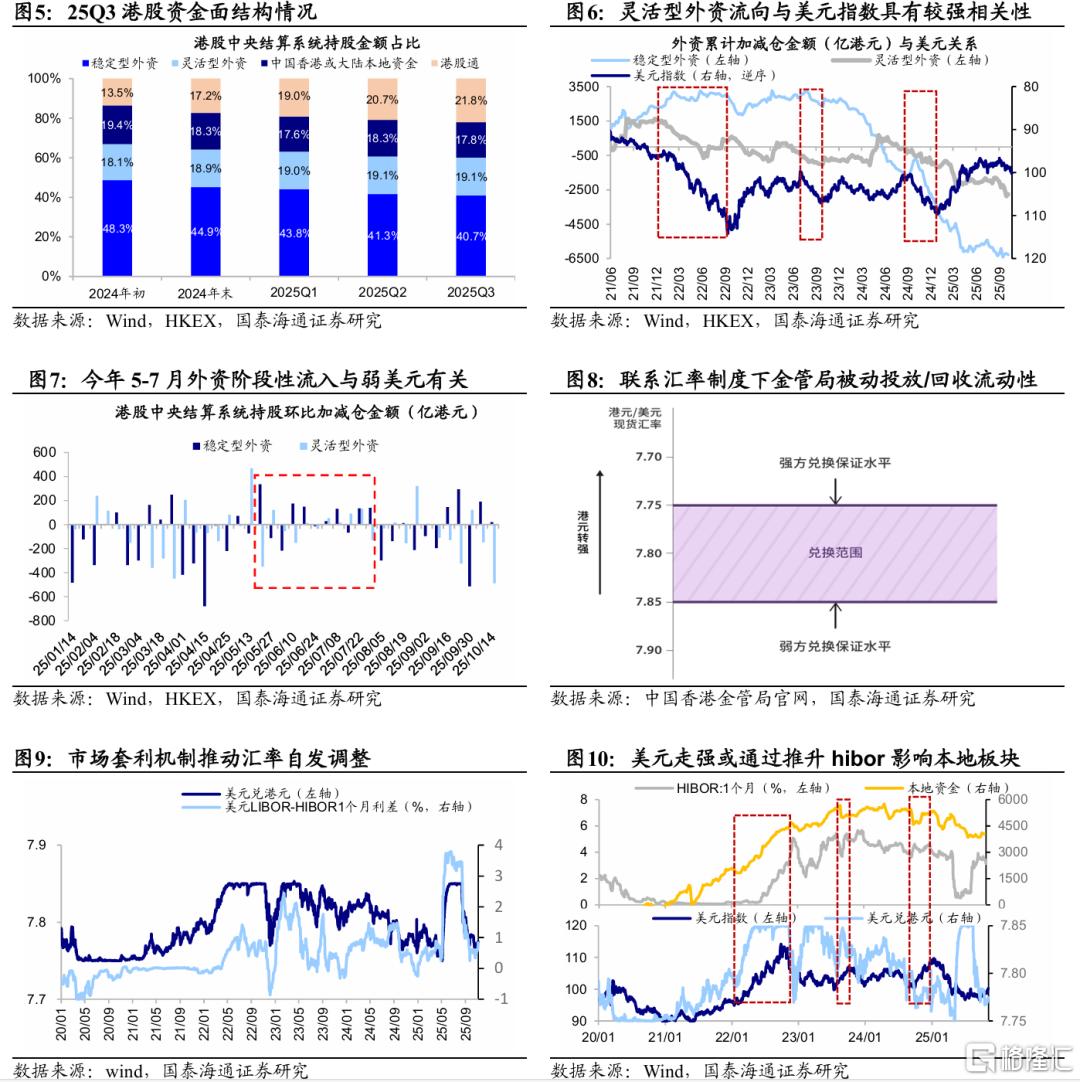 美元資產吸引力提升,或對港股外資形成流出壓力。歷史上看港股外資流向與美元指數具有較高的相關性,其中,由於靈活型外資對於流動性變化更為敏感,因此其更易受到美元指數的影響。我們回顧21年以來幾次美元指數快速走強的階段,可以發現在21/12-22/09(期間靈活型外資淨流入-1115.6億港元,穩定型外資淨流入538.7億港元,下同)、23/07-23/09(-574.8億港元、-411.2億港元)、24/09-25/01(-937.2億港元、-2124.6億港元)三次美元走強期間,港股靈活型外資均呈流出態勢,而穩定型外資雖偏向長期配置,但在美元強勢環境下亦可能會受到一定影響。值得注意的是,今年以來外資流向也與美元環境有關:今年5-7月在弱美元邏輯發酵、中美談判階段緩和背景下,長短線外資均階段性迴流港股,但7月後美元指數反彈,加之此後中美談判不確定性再起,外資流向有所反覆。