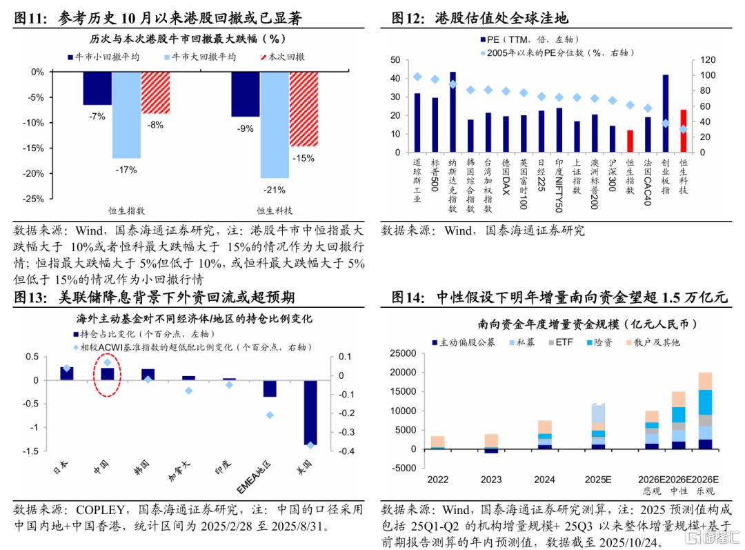 ②港股增量資金確定性較高。外資方面,前期持續流出的外資於年中以來或已現企穩跡象,若後續聯儲局降息持續,中美貿易關係繼續趨穩,外資迴流港股規模有望超預期。內資方面,近年來內資定價權有所提升,25年南向累計流入已近1.2萬億元,明年南向資金望繼續流入港股超1.5萬億元,有望推動港股行情繼續向上。
