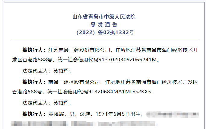10月11日,青島中院發佈了針對南通三建、三建控股、黃裕輝等多人的懸賞通告,有效期至2026年10月10日。