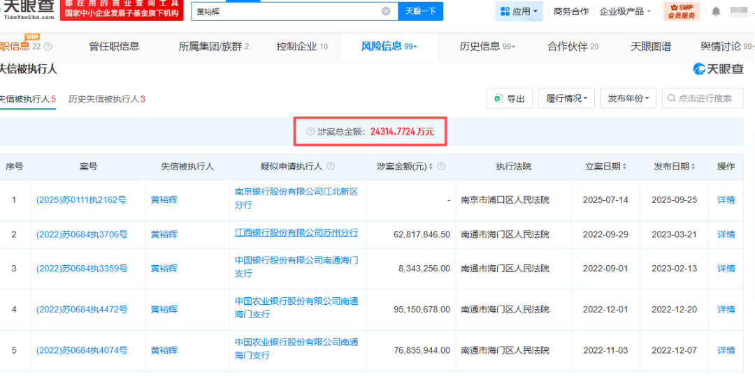 天眼查數據顯示,截至目前,黃裕輝共存在5條失信被執行人記錄,涉案總金額為2.43億元。