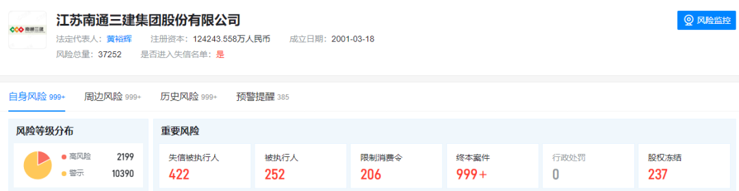 天眼查信息顯示,截至目前,南通三建共有422條失信被執行人及237條股權凍結記錄,涉限制消費令206條。