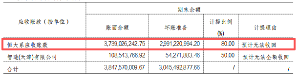 其中,恒大系應收賬款高達37.39億,因預計無法收回,公司計提壞賬準備29.91億元,計提比例高達80%。