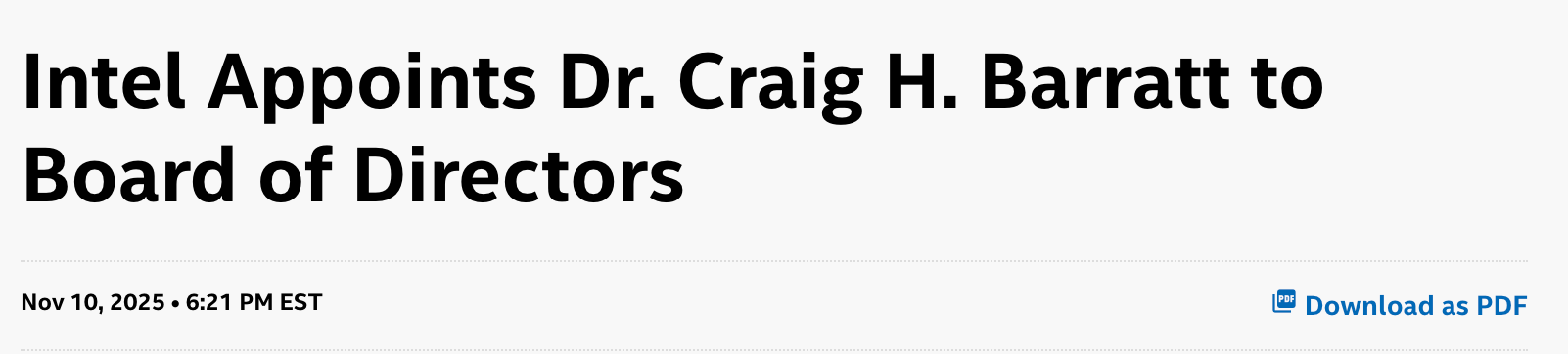 同在今天,英特爾還任命了Craig H. Barratt為董事會成員。